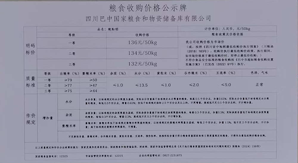 為認真貫徹國家糧食收購政策,全面落實省、市決策部署,踐行糧食安全黨政同責(zé)責(zé)任,充分發(fā)揮行業(yè)主體責(zé)任,做好秋糧收購工作,切實保護種糧農(nóng)民利益?,F(xiàn)將四川巴中國家糧食和物資儲備庫有限公司2025年秋糧收購相關(guān)信息公示如下: